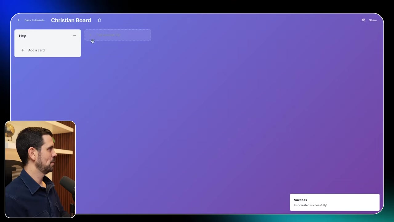 로그아웃 → 다시 로그인 테스트도 완벽! Christian은 강조해요: "테스팅이 전부예요. 여러 사람이 가입하고, 보드 만들고, 사용해보게 하세요."