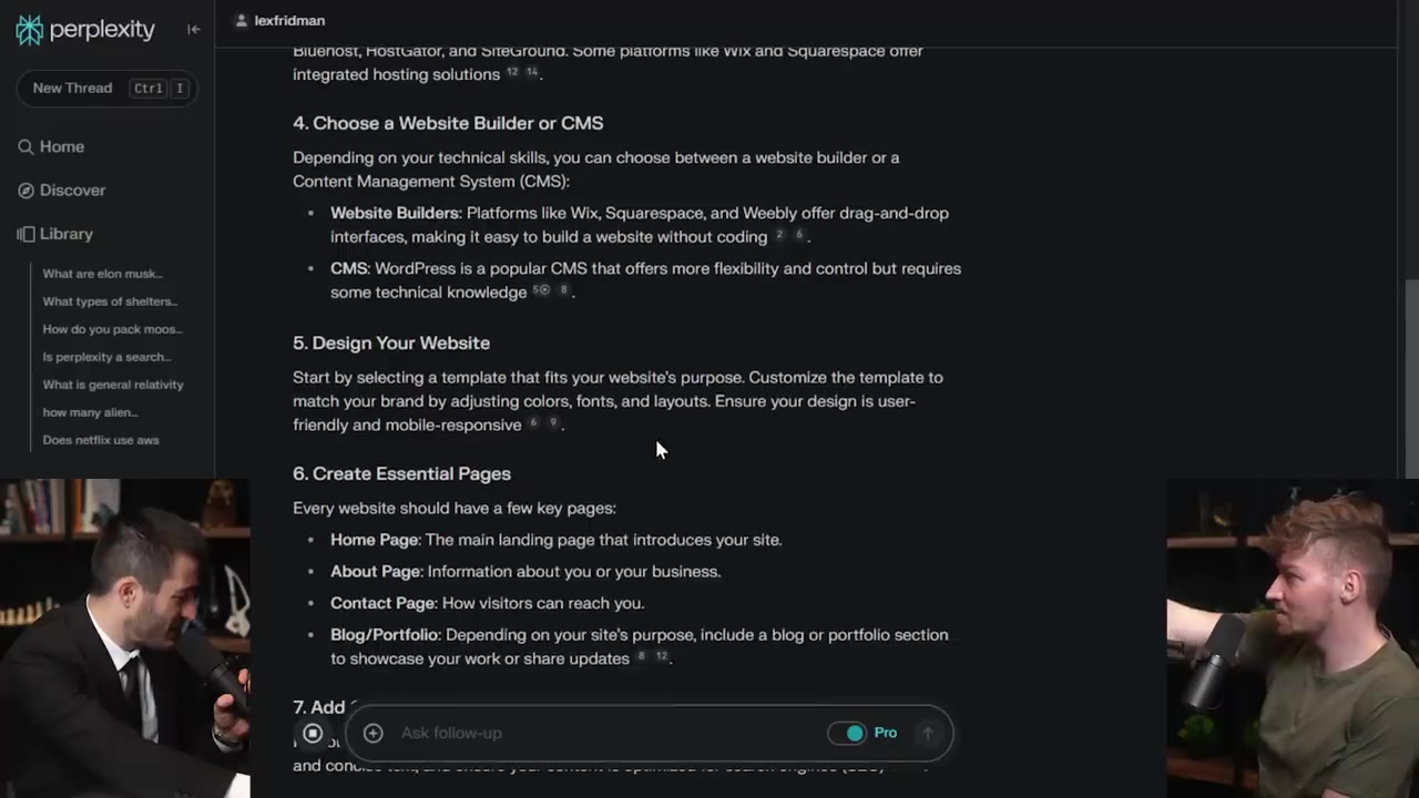 จริงๆ ในการสัมภาษณ์ Lex ถาม AI "สร้างเว็บไซต์ยังไง?" และ AI ให้คำตอบที่ดีทีเดียว ตั้งแต่เลือก domain เลือก hosting ไปจนถึงแนะนำ builder อย่าง Wix หรือ Squarespace