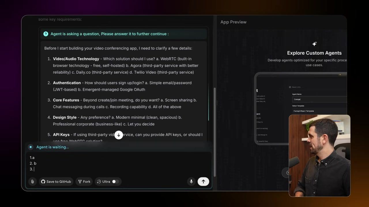 Điều kỳ diệu là Emergent bắt đầu hỏi ngay lập tức. Công nghệ video/audio sẽ dùng gì, đăng nhập bằng email hay Google, cần chia sẻ màn hình hay chat không... Giống như đang viết tài liệu kế hoạch sản phẩm.