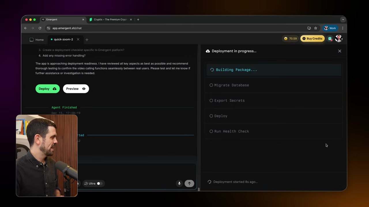 Chiến lược đầu tiên là chọn công cụ. Vì cần tạo ứng dụng phức tạp, anh ấy chọn công cụ AI coding 'Emergent'. Nó đã làm tốt với các ứng dụng phức tạp trong các thử thách trước. Đặc biệt cần công nghệ video streaming như WebRTC, phức tạp hơn nhiều so với ứng dụng thông thường.
